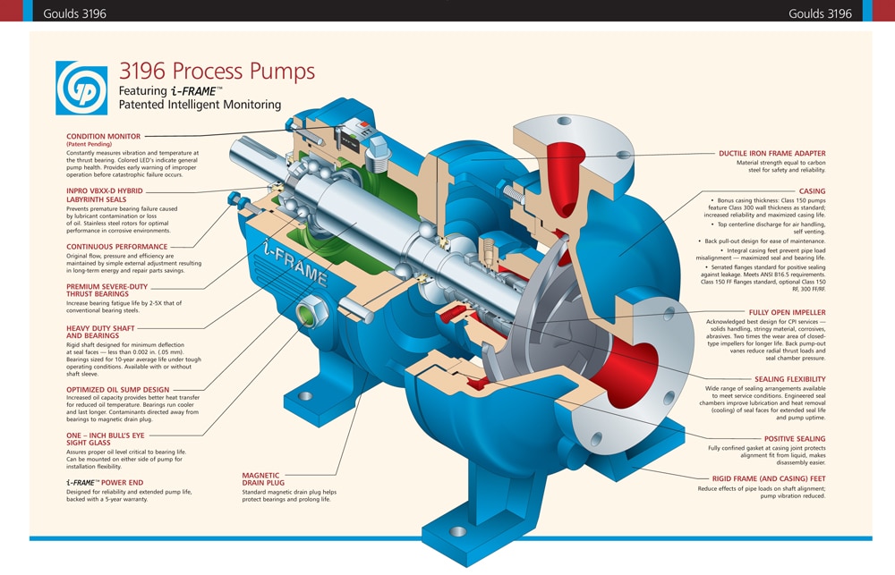 With proven performance, the Goulds 3196 ANSI Standard Dimension Process Centrifugal Pump has been an industry standard since 1961. These 3196 pumps are certified to NSF/ANSI 61 and feature i-FRAME® Intelligent Monitoring to extend MTBF (Mean Time Between Failure) while also lowering LCC (Life Cycle Cost).
